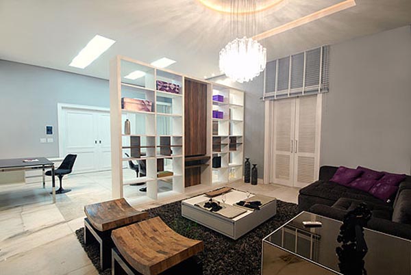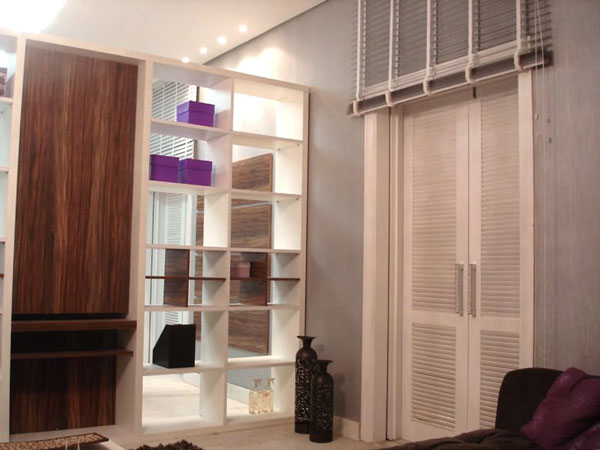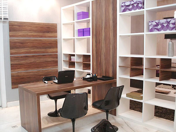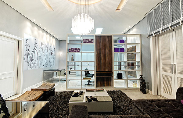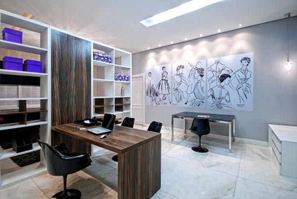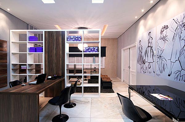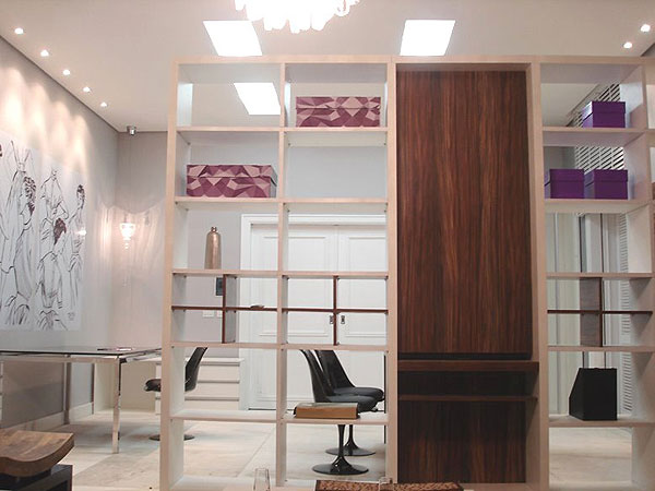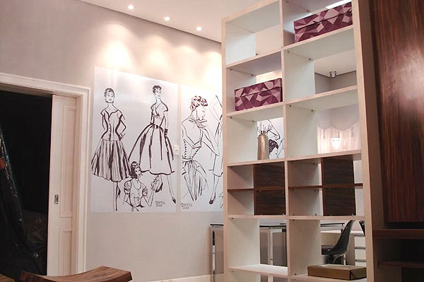 Com a mesma estante rebati o outro plano que era o atendimento e a sala de criação onde o estilista desenvolve e dá asas a sua imaginação.