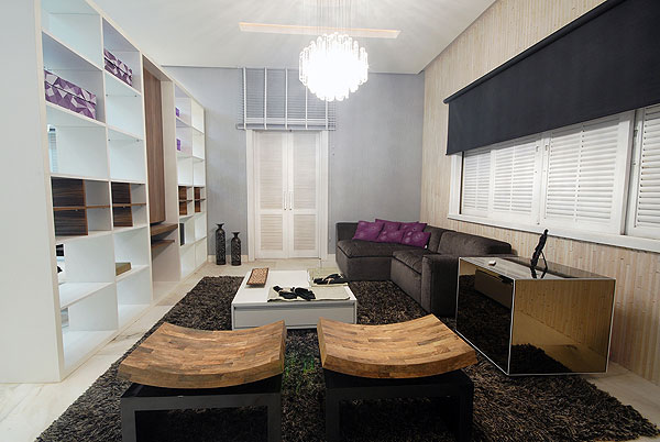 O espaço era dividido em dois espaços semi-integrados com uma sala de espera onde os visitantes assistem a desfiles, make off de produções de moda e reportagens em uma TV localizada no móvel que dividia a sala.