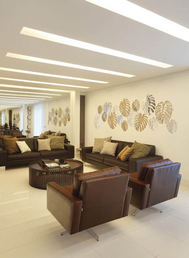 Neste projeto priorizei a arquitetura com todas as suas nuances, desde a construção de pilares falsos e iluminação indireta feita por rasgos no gesso, até a decoração. Alguns objetos foram inseridos no projeto que já eram do morador que não abriu mão de aproveitá-los a nova realidade do imóvel. O piso de porcelanato na cor…