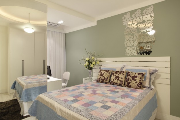 A colcha de patchwork da Mania de Pano em tons sortidos de azuis, rosas e lilases, dão aconchego ao quarto. A escultura de acrílico espelhado complementa a parede.
