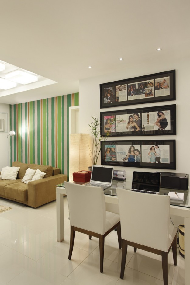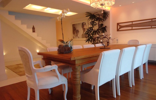 Nesta cobertura de dois pavimentos o arquiteto trabalhou com tons terrosos e aproveitou materiais como o piso da sala de jantar, onde originalmente havia dois quartos. O piso original do prédio era feito com tábuas de 10 cm de peroba mica, que foram transformadas por Thoni Litsz em um tapete para abrigar a mesa e as cadeiras.…
