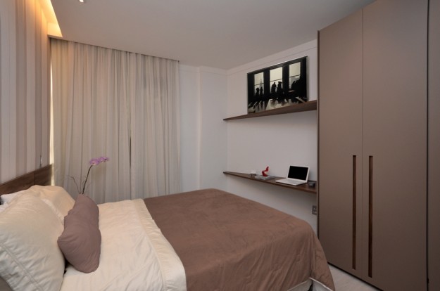 O projeto do quarto do casal ganhou modernidade cores neutras e um espaço útil maior. A cama queen size ganhou um painel de cabeceira reto e preso na parede aumenta a circulação do quarto, o papel de paredes em listras verticais aumentou o pé direito que foi rebaixado para embutir a iluminação que valoriza os…