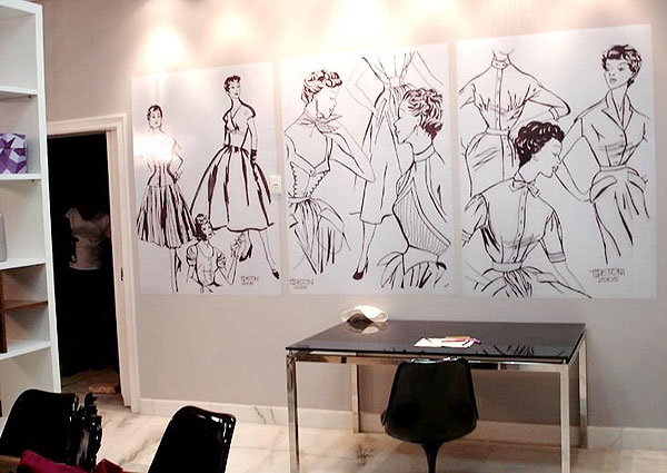 Estes croquis da parede foram inspirados em revistas de moda que minha avó materna colecionava datadas de 1952 – exemplares da revista La Família. Criei estes croquis respeitando as formas e modelos da época, desenhei e ampliei o que deu origem a um espaço moderno e muito funcional. Criei um atelier para um Estilista homenageado…