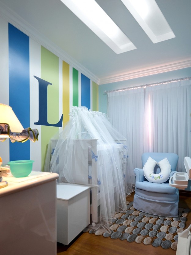 Para a espera do menino Lucas o arquiteto Thoni Litsz tomou algumas providencias para deixar o espaço todo pronto para sua chegada! A antiga poltrona foi revestida de couro ecológico azul bebê reafirmando a cor do quarto! O azul garante uma tranquilidade e bom sono para o menino. O tapete de crochê é da Manya de…