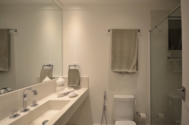 A mudança da abertura da porta que antigamente era lateral dificultava a arrumação interna deste banheiro que antes era muito sacrificado pelo seu layout. A abertura da porta pela parede do banheiro facilitou a bancada ser maior, um box amplo e muito off white para compor o pequeno banheiro de hospedes. Objetos de porcelana…