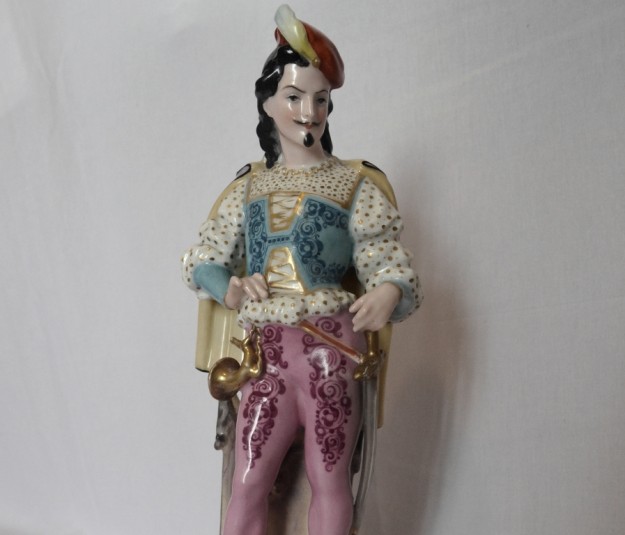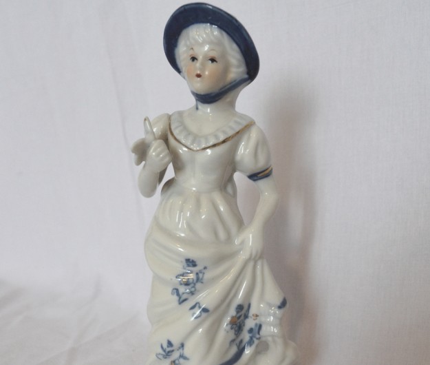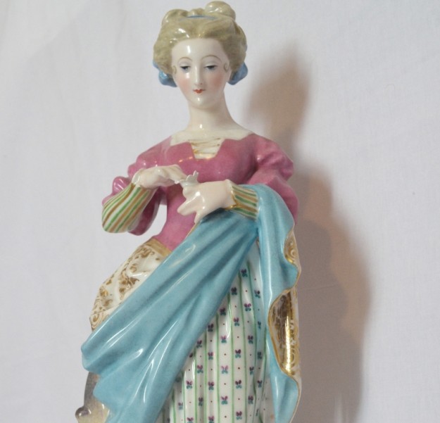 Esta é uma bela escultura manufaturada pintada à mão de porcelana retratando uma jovem vitoriana sentada em um sofá e tocando um bandolim. Há um papagaio no braço do sofá espiando a jovem tocar. Ela tem cabelos ruivos e olhos azuis e está usando um vestido de renda muito cheio de babados em porcelana branca…