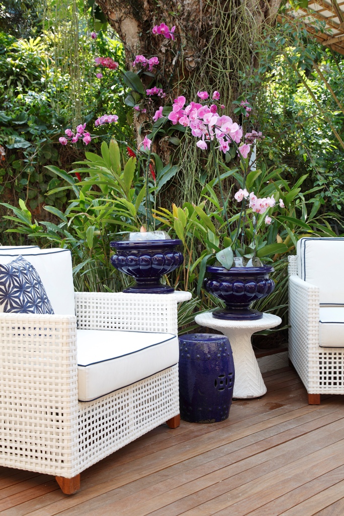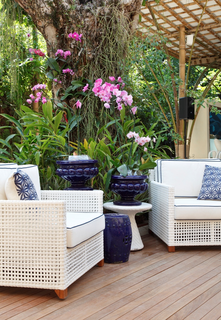 As cadeiras e o mobiliário externo são da Breton Actual. Os arranjos são da Paisagista Paula Bergamin que valorizam o espaço Garden ambientado por Thoni Litsz para valorizar o deck anexo a loja.