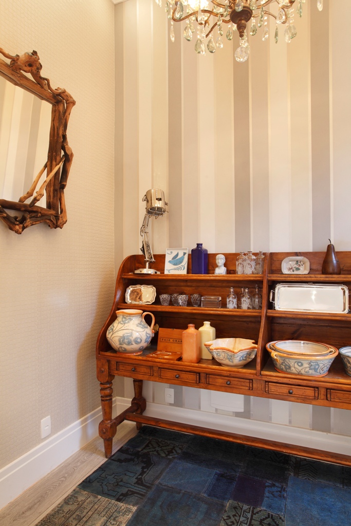 Os Lustres, objetos de decoração, móvel de madeira são da loja da Lalla Bortolini.