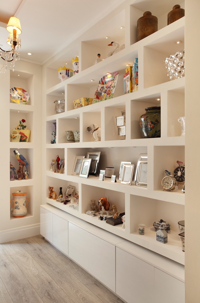 As estantes de gesso cartonado tiveram uma iluminação direcionada para o produto de mini led é da Prolight e valoriza cada peça exposta.