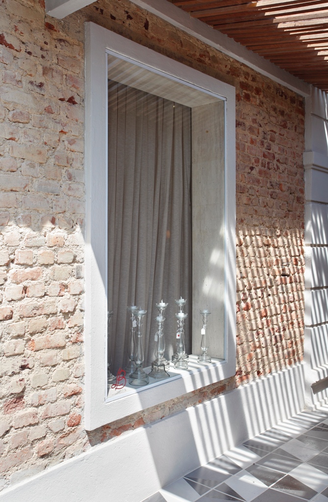 A cortina de gaze de linho em um tom de areia escuro dá o acabamento entre a vitrine que impõe os castiçais da Lalla Bortolini e compõem a fachada de tijolos aparentes.