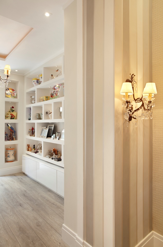 O papel de paredes é lançamento da Orlean que praticamente é um composet escolhido pelo arquiteto composto por listras verticais que prolongam ainda mais a parede dando uma sensação de que o espaço é ainda mais alto, e outro no mesmo tom em formato de quadrados com algumas imperfeições harmonizando o ambiente devido aos tons expostos.
