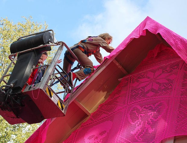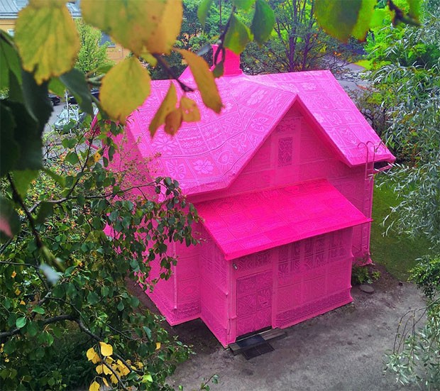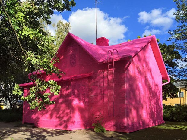 “Vivemos tempos difíceis, em um mundo de mudanças e cheio de conflitos, guerras e desastres naturais. Mas eu gosto de pensar que também é um mundo cheio de amor”. É com esta frase que a artista polonesa Olek descreve as razões pela qual resolveu chamar refugiadas sírias e ucranianas para sua mais nova intervenção. Utilizando crochê cor de rosa vibrante, ela revestiu casas bombardeadas em Kerava, na Finlândia, e Avesta, na Suécia.