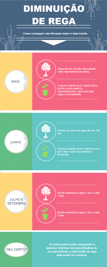 Abaixo está um infográfico ensinando como fazer a diminuição de rega na maioria das dendrobiums.