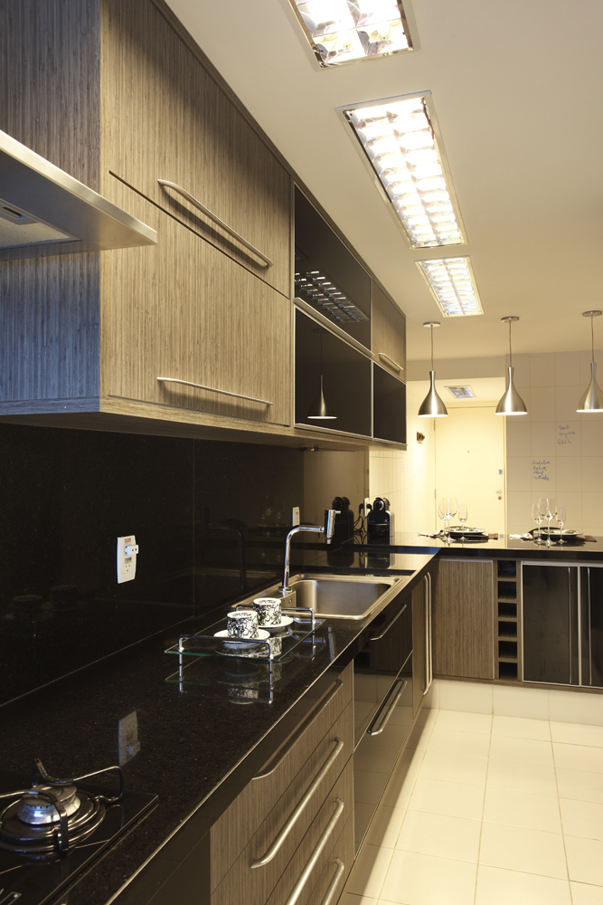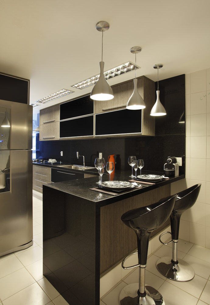 O cliente nos confidenciou que sua cozinha era apenas para preparar pequenos pratos ou mesmo lanches rápidos, porém eventualmente o casal de moradores recebia amigos. Mas quando recebiam era para um pequeno jantar ou mesmo para um drink e usariam também a cozinha como um apoio bar.