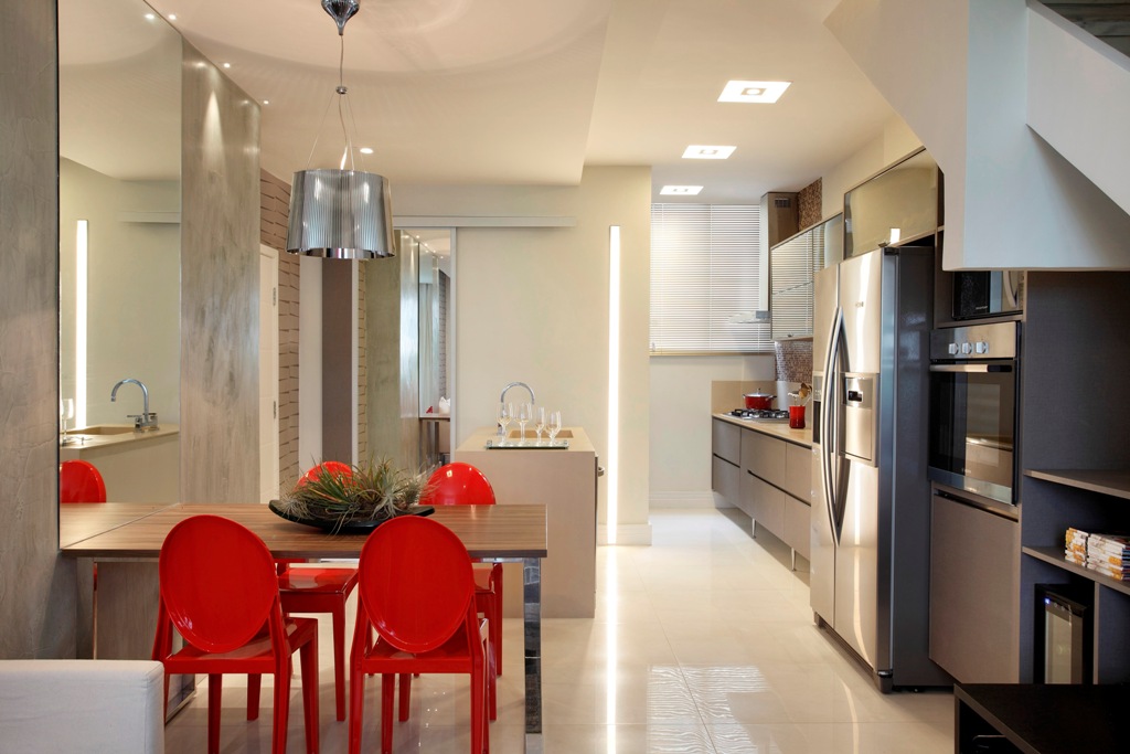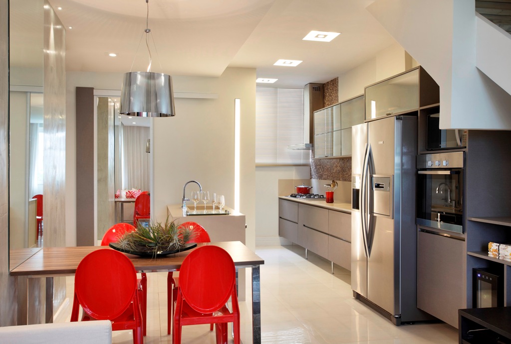 A cozinha tem o mobiliário funcional que facilita na hora de manusear os alimentos. O preparo dos pratos e na lavagem das louças, mas os revestimentos e cores tinham que falar a mesma linguagem da sala de TV.