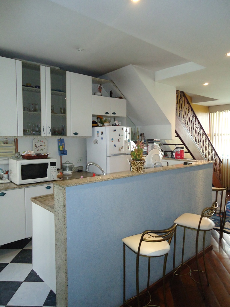 Para isto no primeiro andar do imóvel foi criado uma cozinha que falasse a mesma linguagem arquitetônica de uma sala de estar. Cores, revestimentos objetos e decoração foram totalmente pensados para este projeto. Foi criado um estar gourmet, onde a cliente tem a sala de TV, Sala de Jantar e cozinha no mesmo ambiente.