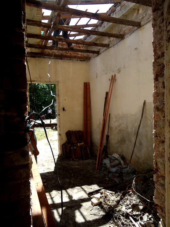 Thoni tomou partido do pé direito alto que a edícula possuía, porém o restante todo foi refeito, cada marretada que os pedreiros deram nas paredes, para nossa surpresa, um pedaço do telhado ou mesmo das paredes laterais se desfaziam como se fossem feitos de areia. A restauração acabou sendo total da lateral do restaurante da casa.