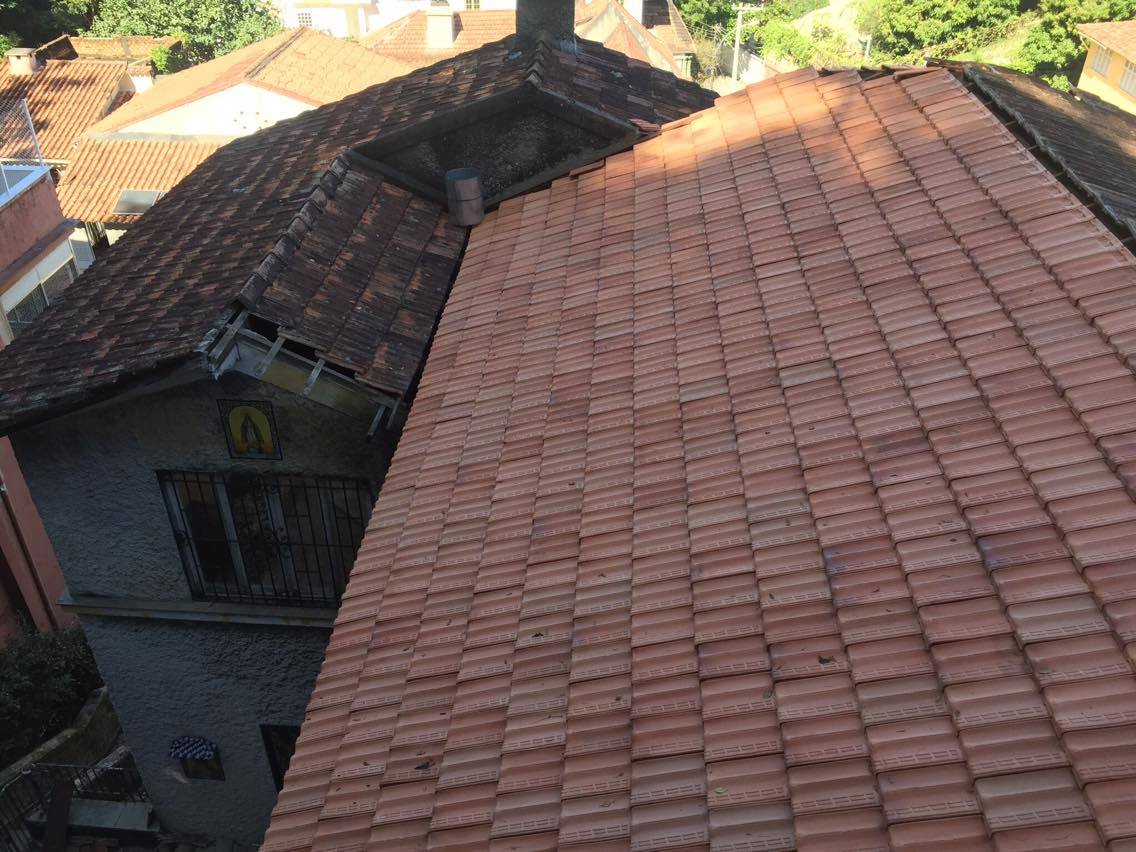 O telhado está quase todo pronto, com todo o madeiramento trocado, telhas reaproveitadas, faltando fazer a cumeeira e os outros telhados menores da casa.