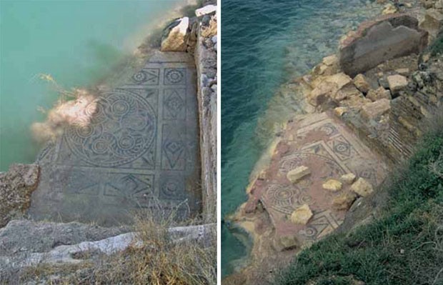 Essa imagem mostra um mosaico que estava debaixo d’água após o salvamento e restauro