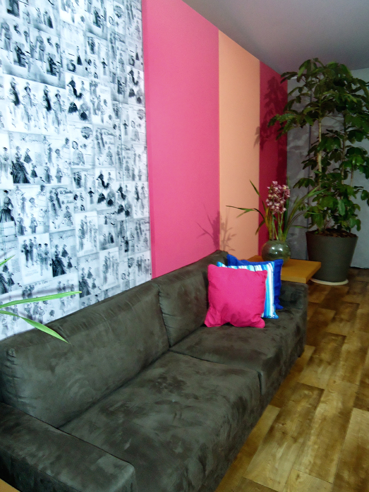 Neste projeto montei um papel de parede com croquis de revistas de moda da década de 50 e 60, em preto e branco para dar um pouco de sobriedade ao excesso de cores impostos pela loja Mitch patrocinadora da jornalista.