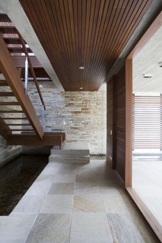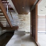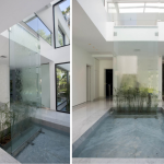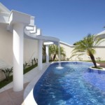 Em um dos projetos assinados por ele, o pequeno lago que compõe o paisagismo do jardim, também serve de cenário para o living e a sala de jantar da casa. A grande janela de vidro projetada na casa é a responsável pela integração das áreas interna e externa.