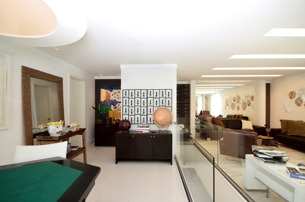 Por se localizar entre a piscina, escritório e sala de TV a linguagem tinha que ter a sofisticação de um local social e o conforto de uma área para o proprietário relaxar.