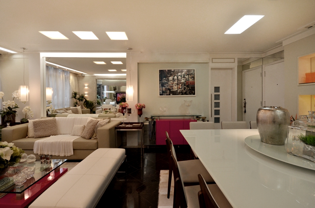 Uma mesa de 12 lugares também foi inserida no contexto para um maior conforto aos convidados da moradora.