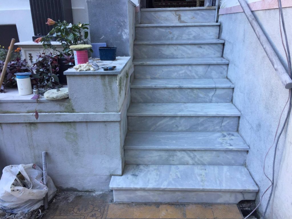 Me deparando com uma obra onde a escadaria da casa era de mármore já sem cor, muito feio e com uma aparência horrível chamei várias empresas que me orientaram fazer a modernização da escada com outras pedras, mas não fiquei satisfeito, afinal a obra era de uma casa de 105 anos que tinha sua escada original de pedra de mármore.