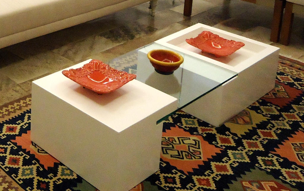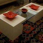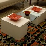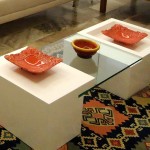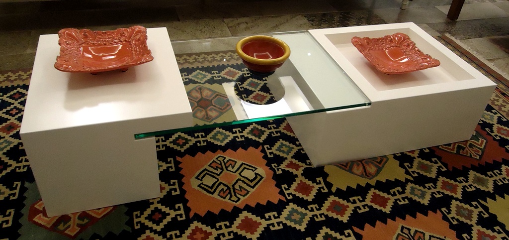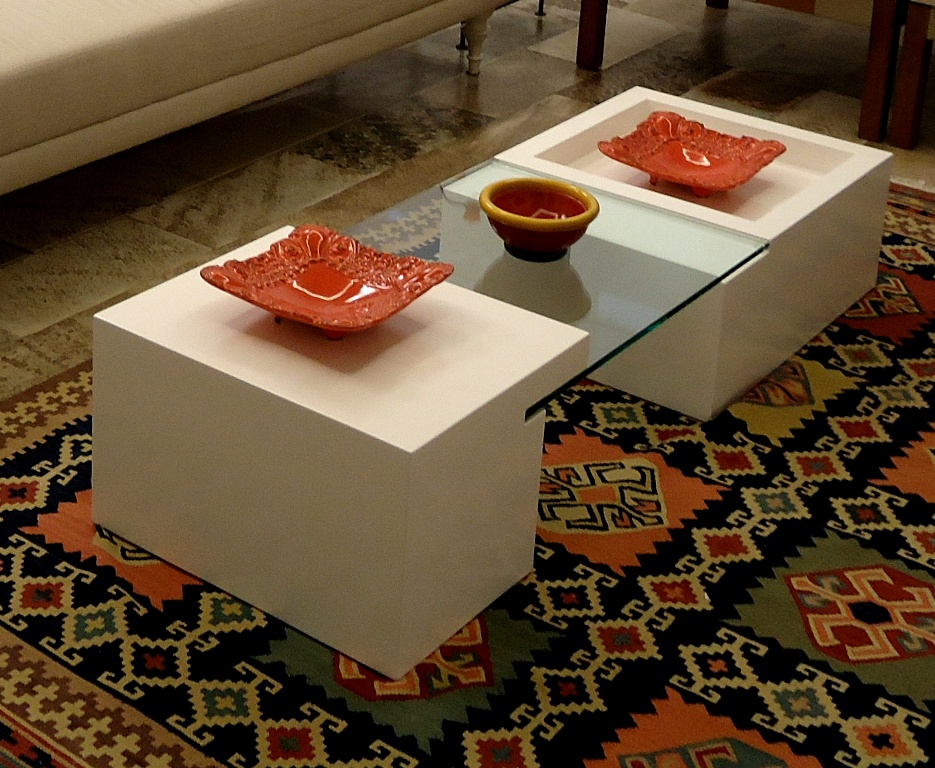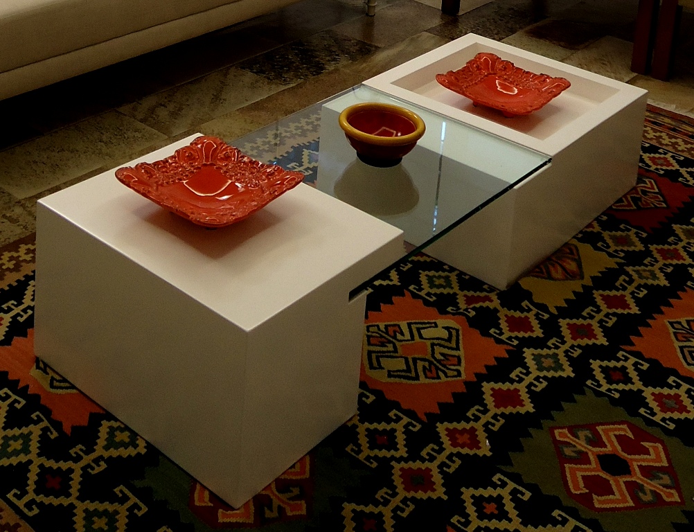 Mesa de centro de MDF de reflorestamento com certificado laqueada com tinta acetinada a base de água com tampo de vidro removível de 15mm lapidado assinada pelo Arquiteto Thoni Litsz.