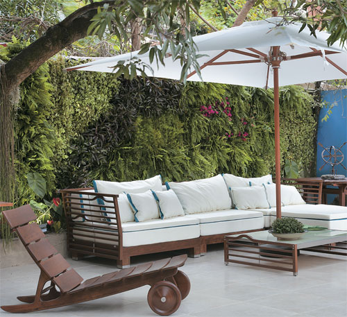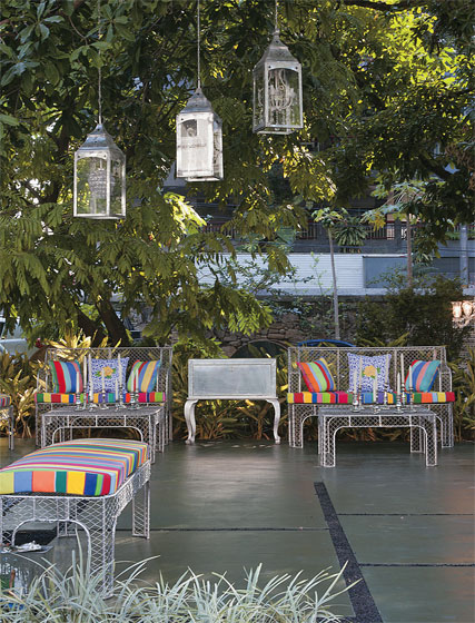 O jardim do Living foi o grande vencedor do prêmio do O Globo, como se fosse uma rede, esta cama de balanço de fibra sintética repousa em pedriscos sob a centenária figueira. “Toda esta área verde já existia no palacete, e eu quis transformá-la em um lugar lúdico e de descanso”, conta a paisagista Paula Bergamin.