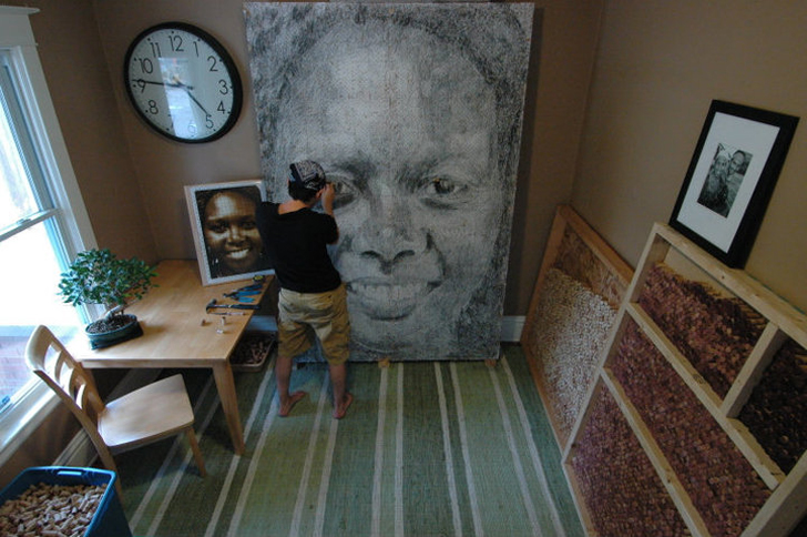 As fotos originais são usadas como referência para a reprodução em grande escala, feita à lápis. Depois de trabalhar em todo o contorno e sombreamento, a base está pronta para que as milhares de rolhas de cortiça coletadas e separadas por cor no estúdio sejam adicionadas.