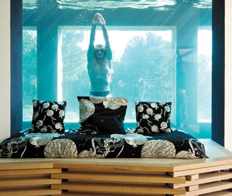 O fato da sala e a piscina estarem em um nível elevado, possibilitou a instalação de visores nos dois lados da piscina, criando a falsa impressão de uma paisagem submersa, como uma vegetação marinha.