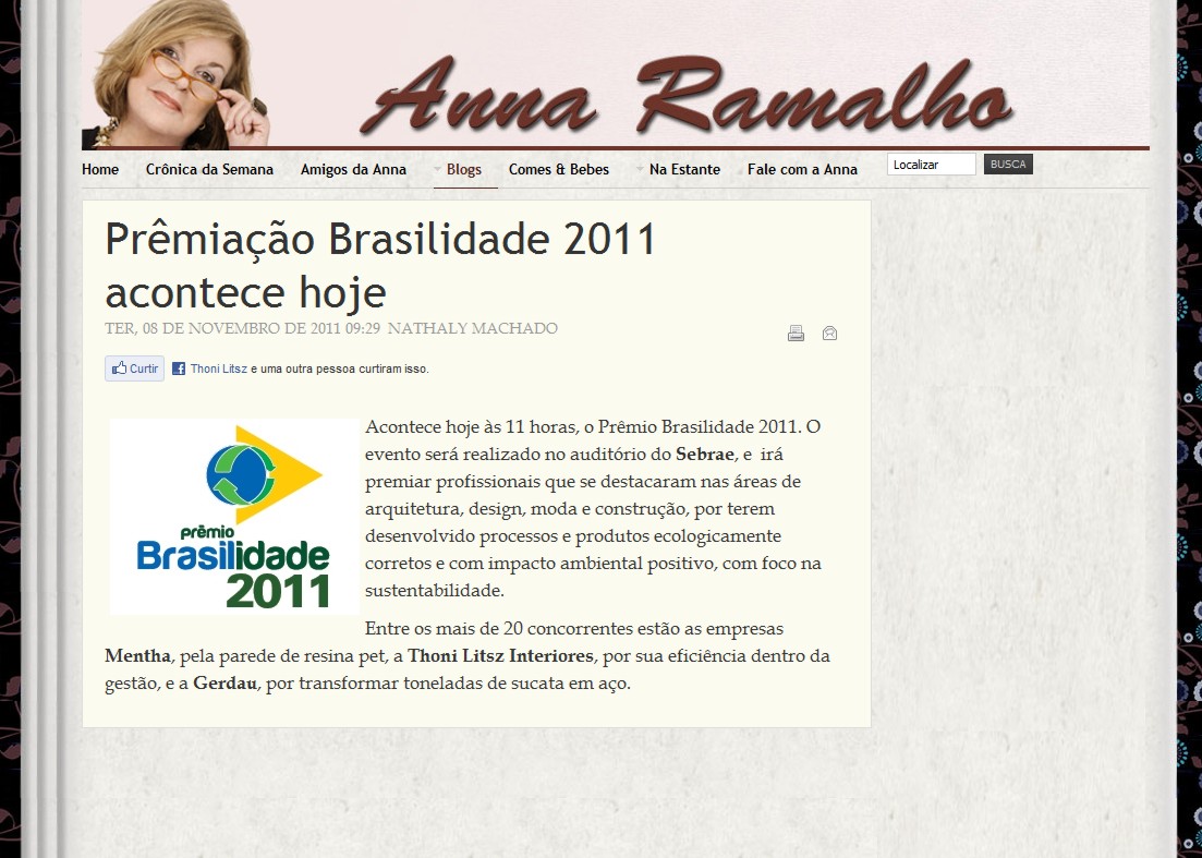 Acontece hoje às 11 horas, o Prêmio Brasilidade 2011. O evento será realizado no auditório do Sebrae, e irá premiar profissionais que se destacaram nas áreas de arquitetura, design, moda e construção, por terem desenvolvido processos e produtos ecologicamente corretos e com impacto ambiental positivo, com foco na sustentabilidade.