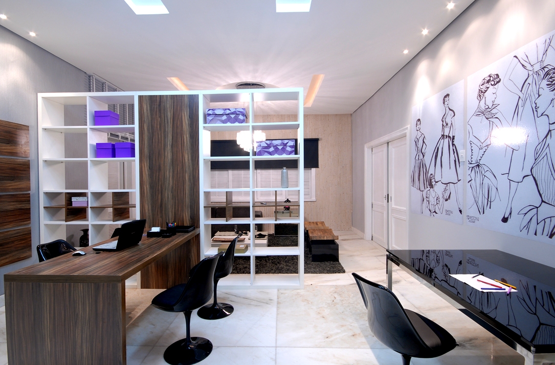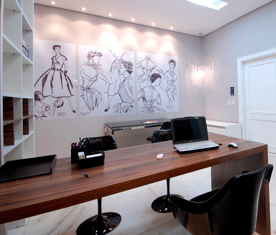 Os croquis trouxeram personalidade a sala de criação, os poucos móveis foram para simular um atelier e ao mesmo tempo não poluir o espaço. Usei cores masculinas e o mais neutras.