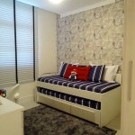 O cliente deste projeto tem apenas oito anos idade, que adora o personagem Mario Bross dos videogames, pensei em um espaço que ele se sentisse bem, pudesse trazer amigos, e ainda interagir com seus games. A idéia do uso do papel de paredes feito mapas da Orlean, além de ser um tema infantil, não existe nada mais diferenciado do que revestir uma parede inteira de mapas em tons de azuis que remetem ao mar. A persiana de alumínio branco leva uma fita marinho para ficar diferenciada e compor mais com o espaço. A colcha azul com listras em branco foi escolhida para compor com a cor dos móveis, que é uma mistura de Branco com Rovere Sereno da Inusittá. As almofadas da Tok & Stok em vermelho e caque compõe a cabeceira da cama, e o toque final ficou para o boneco do Super Mario personagem principal do game. O tapete é da Etna e foi escolhido dentro dos tons do quarto.