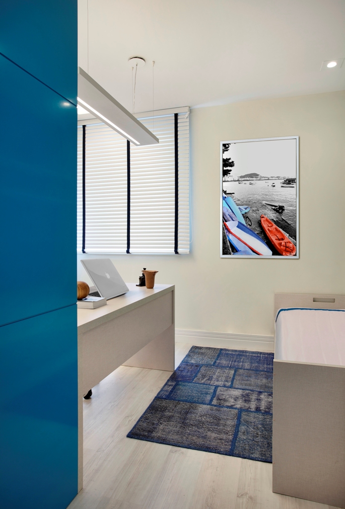 Os tons de azul escolhidos tanto no papel de parede como pontual na colcha, decoração e mobiliário são misturados aos objetos neutros de madeira que contrastam bem entre si e reforçam o tema escritório.