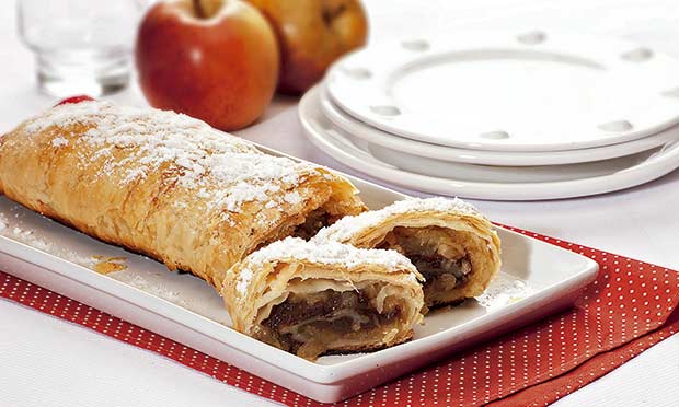 Pincele a massa com manteiga derretida, polvilhe uma faixa horizontal de massa, com 10 cm de largura, com amêndoas picadas e, por cima, distribua a mistura de maçã, deixando um espaço de cerca de 4 cm nas duas extremidades da faixa de massa para o recheio não escapar enquanto enrolar o strudel.