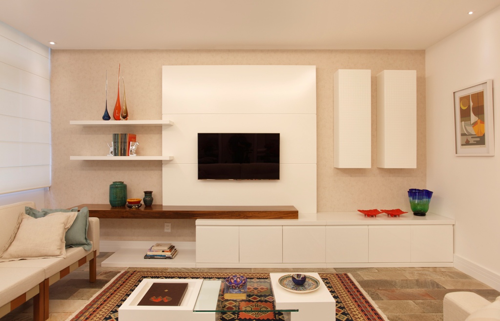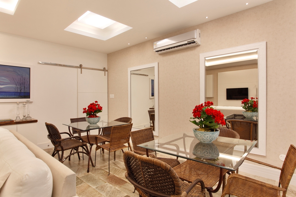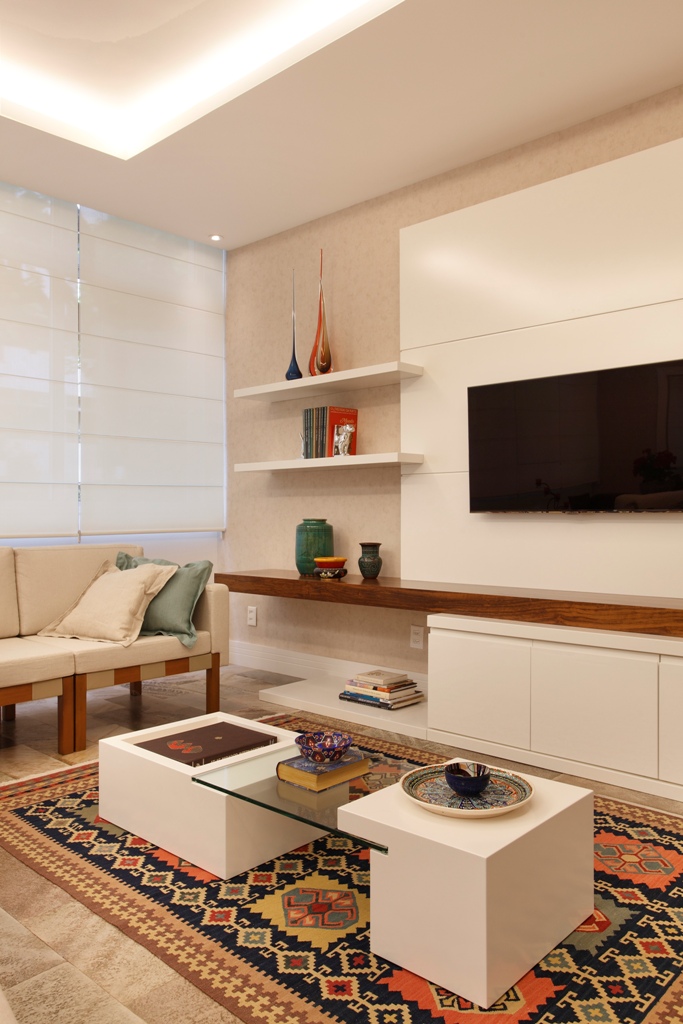 Para este projeto da sala de TV conjugando funções de jantar, jogos e estar ao mesmo tempo o arquiteto Thoni Litsz teve que se adaptar às necessidades do cliente e modernizar a sala sem perder a personalidade das moradoras.