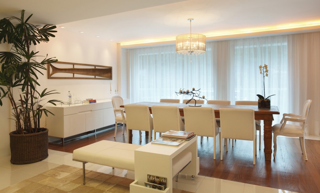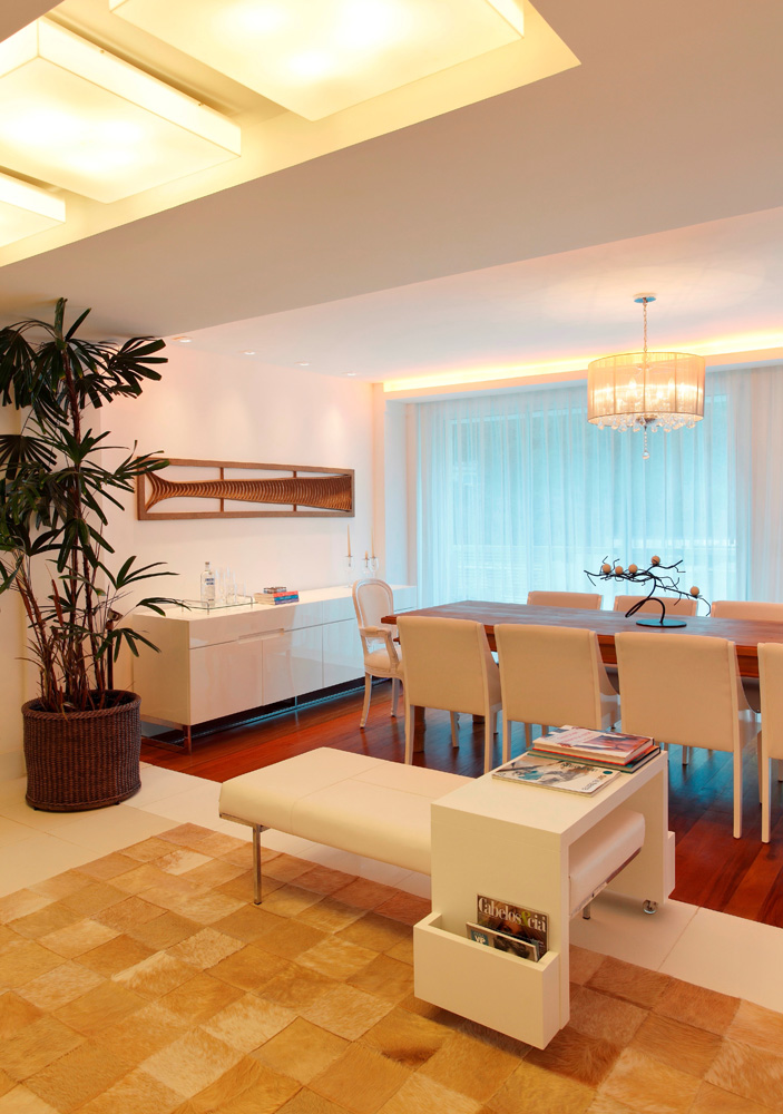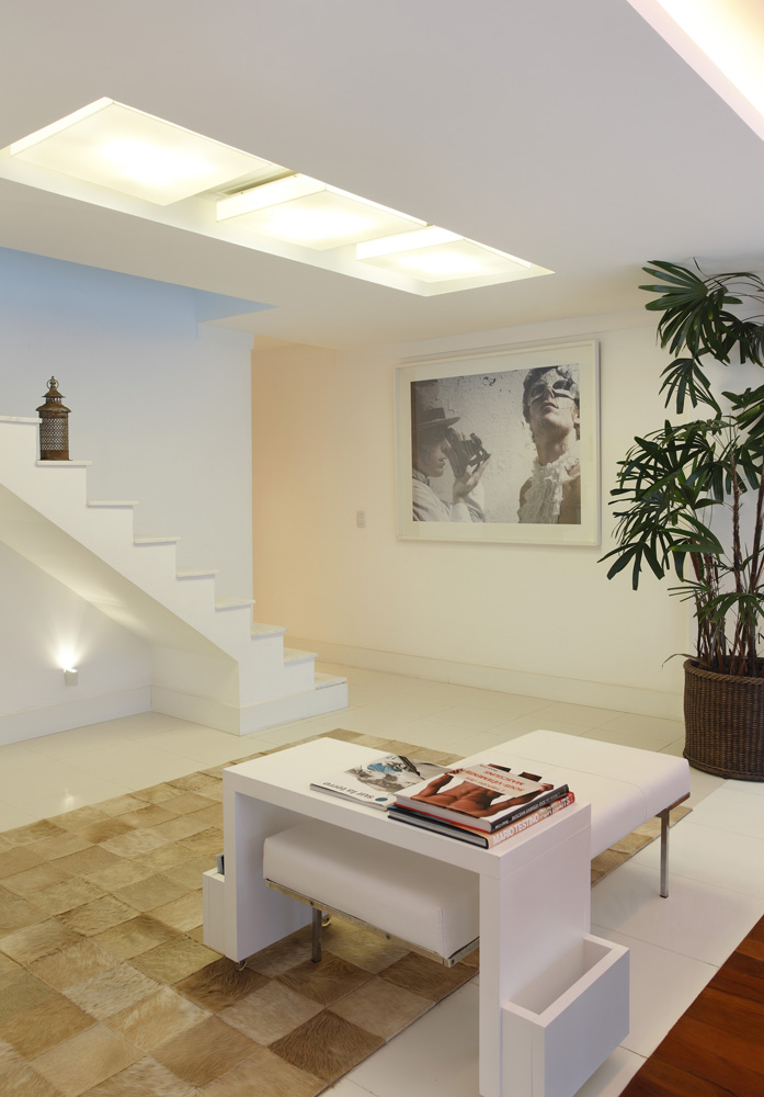 Para isto o arquiteto abusou do branco. O porcelanato em tom mais claro off white, o revisteiro tipo mesa da linha Eco Straight assinada pelo arquiteto Thoni Litsz é a grande vedete deste projeto, pois nela ficam bem expostos livros e revistas.