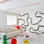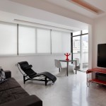 - Sala de TV com a predominância do branco apenas pontuando cores.