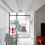 - Pequena sala de almoço branca com apenas detalhes coloridos