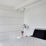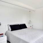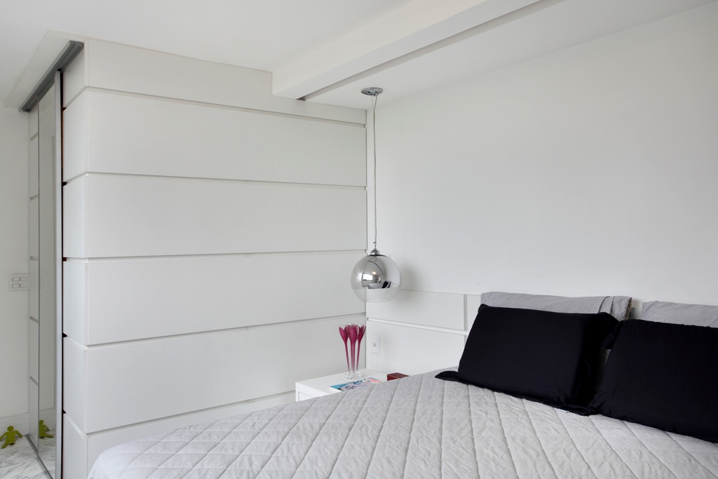 - Quarto do casal branco apenas com almofadas em preto e objetos coloridos