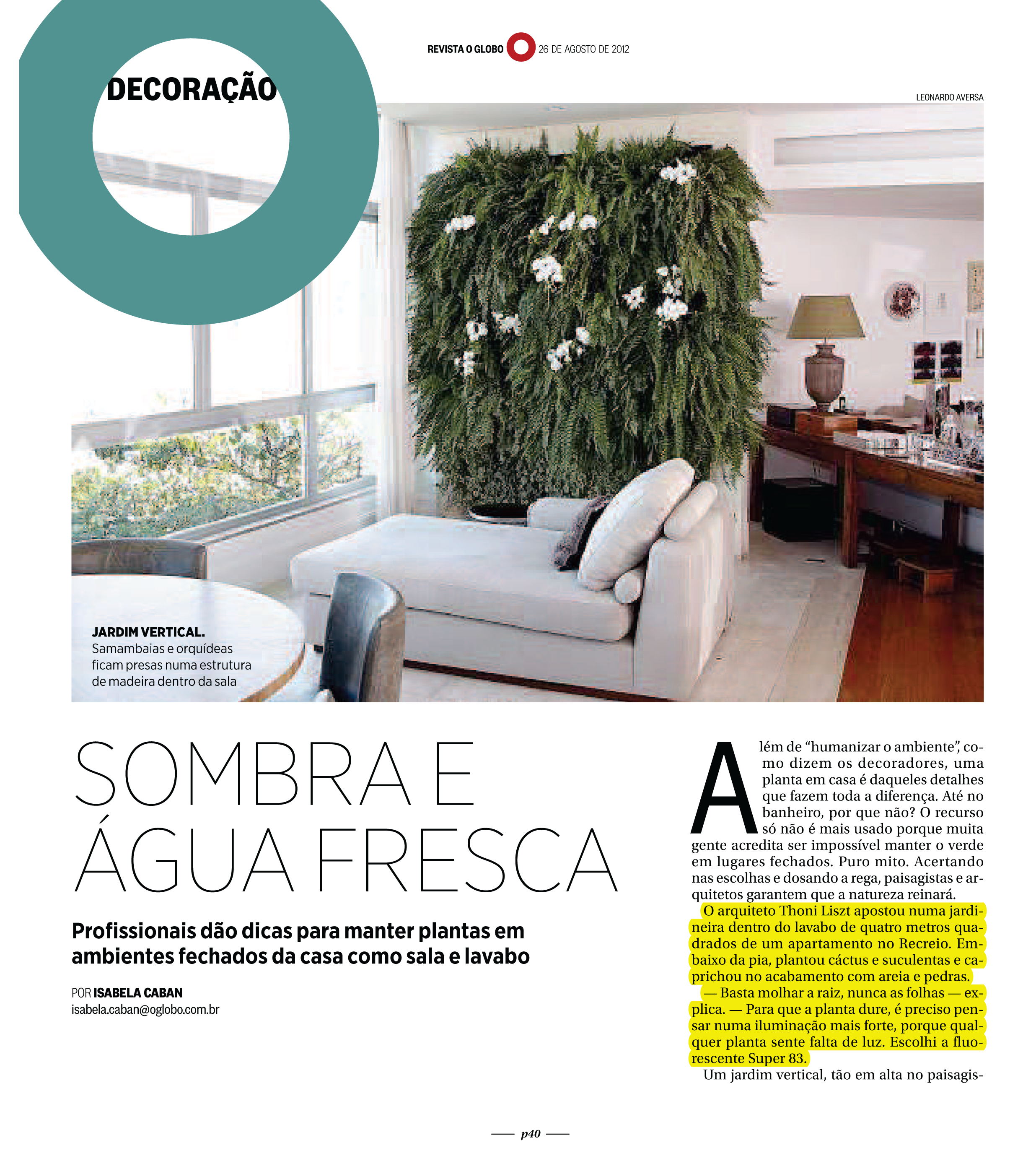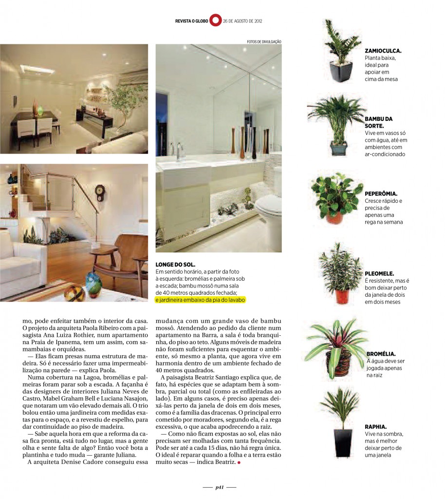 Profissionais dão dicas para manter plantas em ambientes fechados em casa como sala e lavabo.Navegação de post:AnteriorPost anterior:Studio do Chef – 2012PróximoPróximo post:Lápis que pode ser plantadoArtigos similaresCasarão centenário no Cosme Velho que hospedou Evita Perón está a venda22/09/2025Casarão centenário no Cosme Velho que hospedou Evita Perón está a venda por R$ 4,7 milhões após 6 anos de reforma, conheça o local:22/09/2025Reforma do Solar de Laranjeiras em canal russo18/09/2025Revista Informare18/09/2025Projeto do Arquiteto Thoni Litsz é destaque na Revista Lush18/09/2025Saiba como montar um home office funcional e confortável11/06/2025